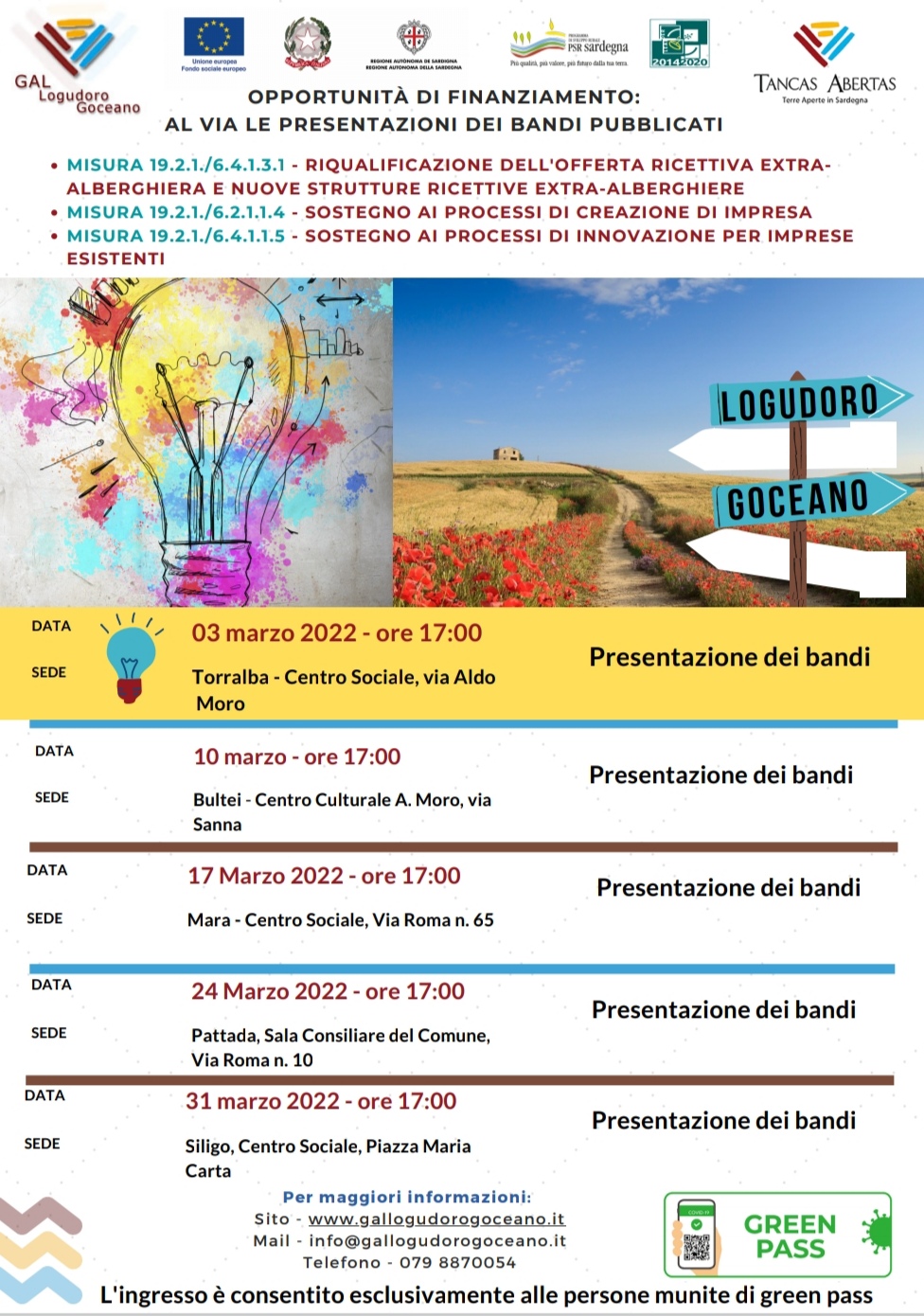 Oggi 10 MARZO 2022 si terrà presso il centro culturale 'Aldo Moro' a Bultei un incontro su OPPORTUNITA' DI FINANZIAMENTO sui nuovi bandi pubblicati: