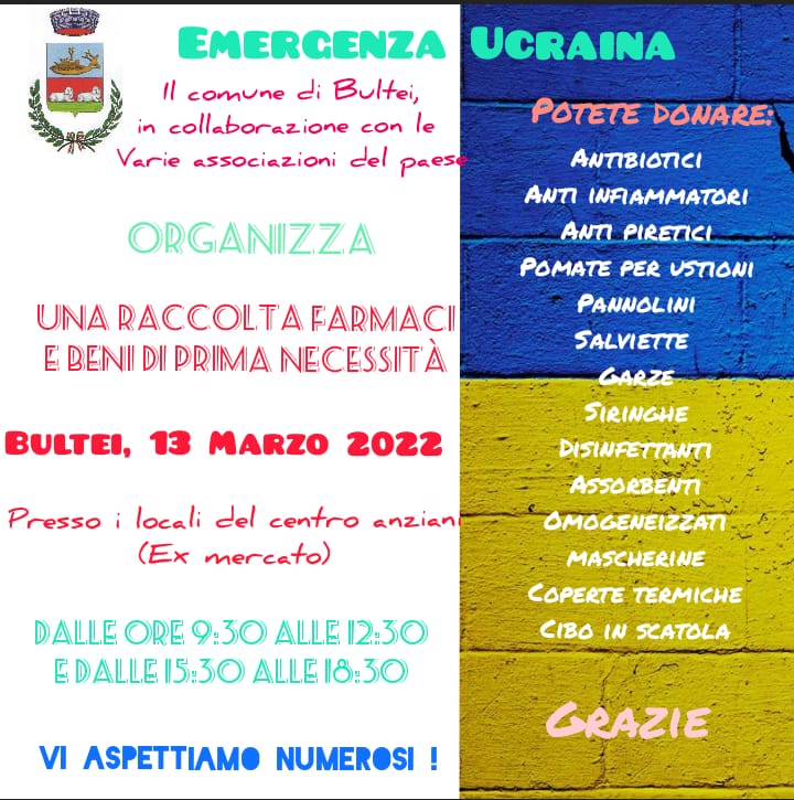 Il Comune di Bultei, in collaborazione con le varie Associazioni del paese, organizza una raccolta di farmaci e beni di prima necessità.