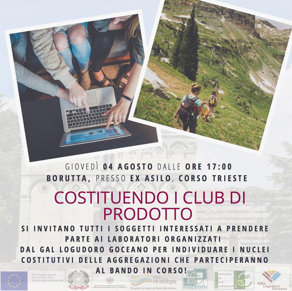 In allegato, la locandina relativa all'incontro ''Costituendo i Club di Prodotto'' che si terrà giovedì 4 agosto alle ore 17:00 presso l'ex asilo di Corso Trieste a Borutta.
